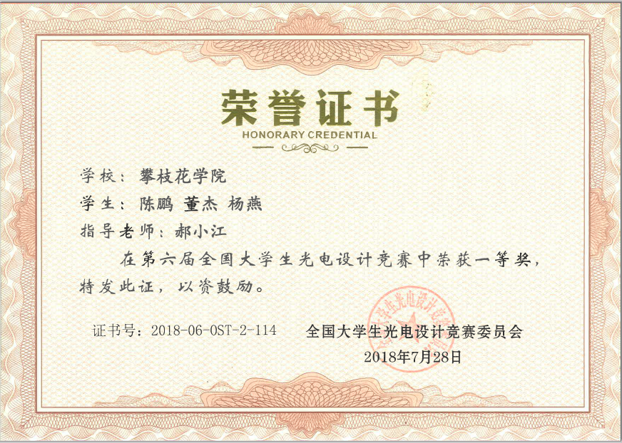 7月27-28日,第六届全国大学生光电设计竞赛在北京理工大学举行,经过单车排位赛和双车对抗淘汰赛及竞赛答辩环节,我校组成的“飞梦队”(2017级自动化董杰、2016级自动化陈鹏、杨燕)勇夺全国一等奖,这也是四川省唯一的一个一等奖,郝小江老师获得优秀指导教师奖。