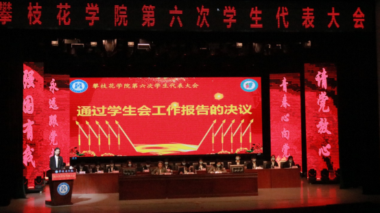 开幕式后,攀枝花学院第六次学生代表大会第一次全体会议在会堂举行,第五届学生委员会委员肖建代表学生会做工作报告:
