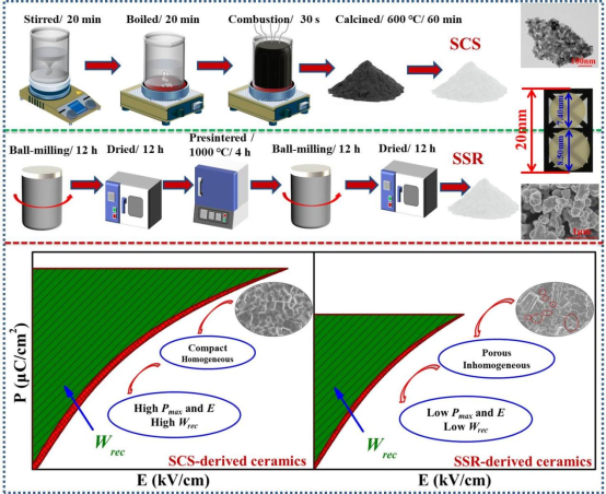 该论文首次提出利用溶液燃烧法(SCS)替代传统固相法(SSR)制备Sr0.7Bi0.2TiO3(SBT)介电储能陶瓷,降低制备能耗的同时大大缩短了制备周期。采用该方法制备的SBT介电陶瓷,晶粒细小,结构和化学均匀度高,具有更高的绝缘电阻率、激活能和击穿电场。利用此方法制备的SBT陶瓷电容器,获得超高的临界电场,储能密度和能量释放效率(543kV/cm、5.21 J/cm3 和 91.55%),同时具有超高的硬度~7.80 GPa。该研究表明,SCS制备的介电陶瓷在储能方面具有巨大的应用潜力。