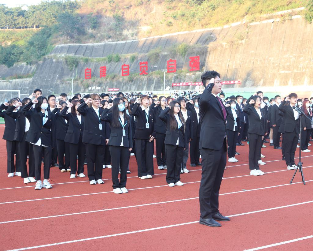 会前,我校学生会在运动场举行升旗仪式并进行学生会自律公约宣誓。