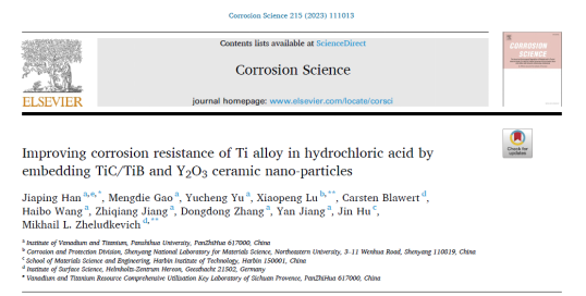 我校钒钛学院韩嘉平博士以我校为第一署名单位在腐蚀领域国际顶级期刊《Corrosion Science》(中科院分区1区Top期刊,影响因子7.72)上发表题为“Improving corrosion resistance of Ti alloy in hydrochloric acid by embedding TiC/TiB and Y2O3 ceramic nano-particles”的研究论文,该论文是我校与东北大学、哈尔滨工业大学、德国亥姆霍兹研究中心等单位合作在金属材料的腐蚀与防护研究方面取得阶段性重大成果,韩嘉平博士为第一作者和共同通讯作者。该研究成果获得了攀枝花市科技局、四川省钒钛资源综合利用重点实验室、四川省钒钛工程研究中心、攀枝花学院培育项目、攀枝花学院博士基金的资助。