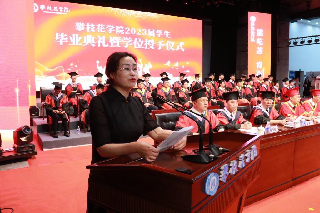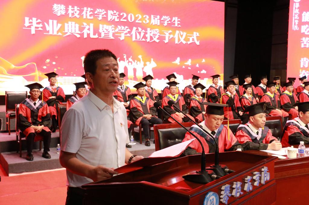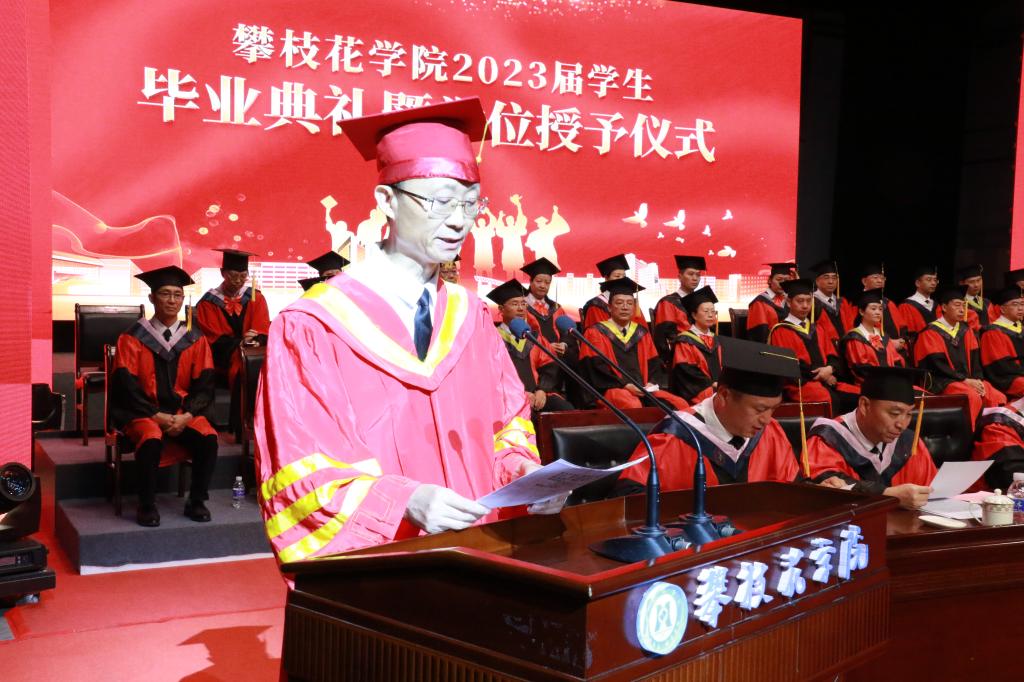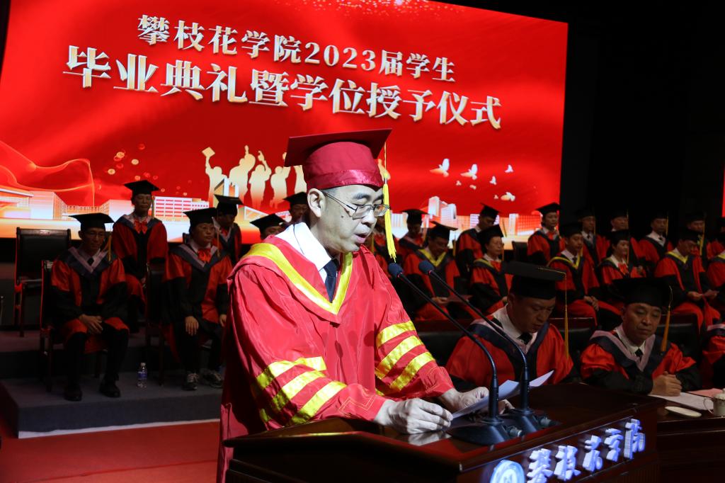 典礼上,党委常委、副校长张旭辉宣读《攀枝花学院学位评定委员会关于2023届本科毕业生的授位决议》,副校长王兵宣读《关于聘任唐锦联等99名同学担任攀枝花学院2023届毕业生校友联络员的决定》,党委常委、副校长朱波强宣读《关于表彰四川省2023届优秀大学毕业生的决定》。