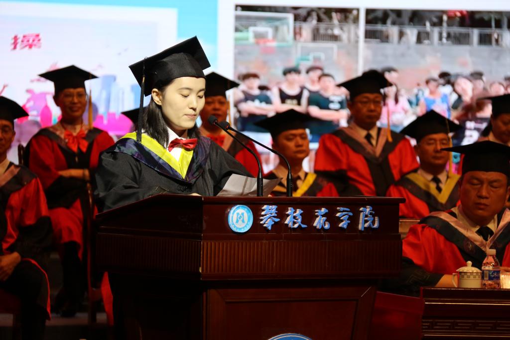 四川省优秀大学毕业生、土木与建筑工程学院邹雪在发言中表达了对母校的不舍之情、对师长的感恩之情和对同学的离别之情,她代表广大毕业生表示,将始终牢记校训,胸怀国之大者、保持平实之心,自律奋进、勇毅前行,不负青春、不负时代。
