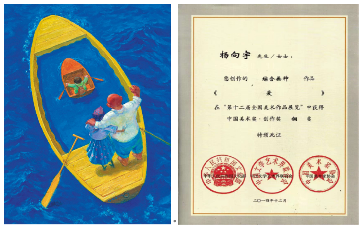 杨向宇漫画作品《爱》及第十二届全国美展铜奖证书 |