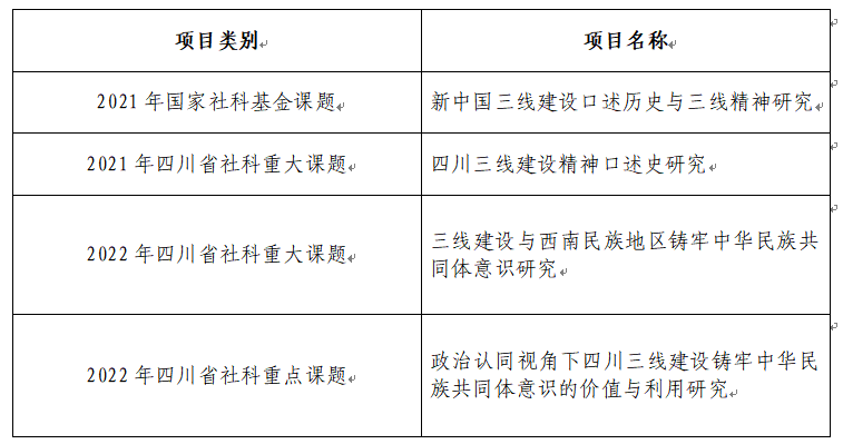 学院依托本地丰富的三线建设历史与文化资源,结合民族地区的特色,整合全校资源,组建了“三线建设历史与文化研究团队”,打造了“三线精神研究”“三线建设口述资料的收集与整理研究”“三线建设工业遗产保护与利用研究”“三线建设与西南民族地区铸牢中华民族共同体意识研究”等多个特色研究方向。经过多年的努力,学院共立项市厅级以上三线建设历史与文化相关课题50余项,其中,立项国家社科基金项目1项,省级重大、重点项目3项,省级一般项目9项,市厅级课题41项;出版三线建设相关著作7部;发表三线建设相关论文70余篇;获得市级以上社科成果奖9项。以“三线建设历史与文化研究团队”为骨干组建的“四川三线建设研究中心”于2022年被认定为四川省社科重点研究基地。学院已经成为全国研究三线建设的重要力量。