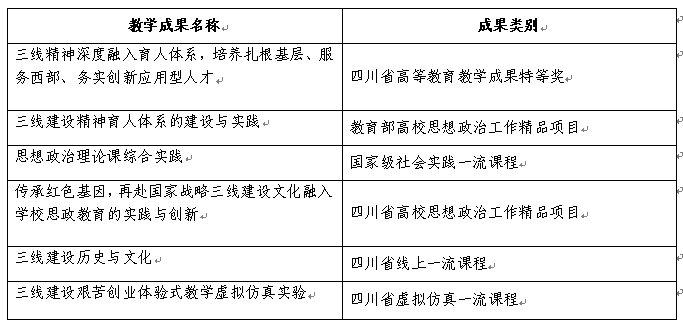 学院紧密围绕立德树人根本使命,通过聚焦内容供给,创新构建“理论+实践、线上+线下、基地+虚仿”多态化教育教学资源,通过开展大学生讲思政课、“优标进课堂”、思想政治理论课综合实践,强化三线精神的思想引领;通过聚焦融入途径,创新构建三线精神深度融入“课堂+科研+文化+实践+网络”等五大育人体系,编写了《三线建设历史与文化》《三线建设之光》《战成昆》《攀枝花英雄•108将》《砥砺奋进铸辉煌》等三线精神育人教材,开发了《三线建设历史与文化》三线精神育人网络慕课,建设了全国首个以三线建设为主题的虚拟仿真实验项目“三线建设艰苦创业体验式教学虚拟仿真实验”,打造了攀枝花中国三线建设博物馆、大田会议遗址、攀钢钒轨梁厂等30多个三线精神育人实践教学基地。强化三线精神育人实效,培养“能吃苦、留得下、用得上”,扎根基层、服务西部、务实创新应用型人才取得显著成效,成为学院教学改革的显著特色。