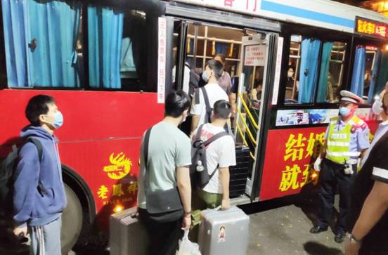 工作人员组织学生上车