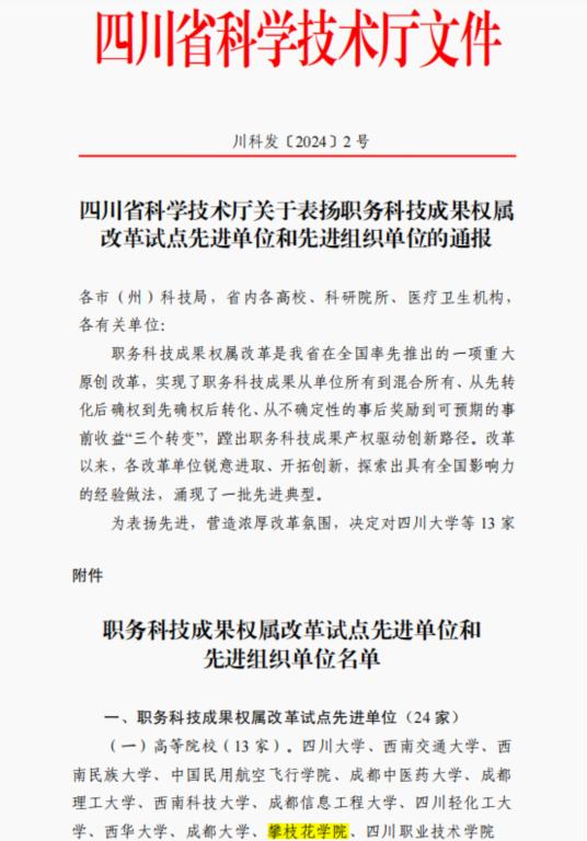 近日,四川省科学技术厅通报表扬了一批职务科技成果权属改革试点先进单位和先进组织单位,我校荣获职务科技成果权属改革试点先进单位。