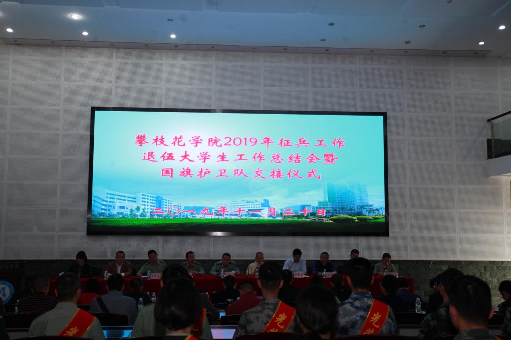 11月20日,我校在学术报告厅举行2019年征兵工作、退伍大学生工作总结会暨国旗护卫队交接仪式。校党委书记肖立军,攀枝花军分区副司令员张德勇大校,攀枝花市退役军人事务局代表出席会议,各部门负责人及全校退伍大学生,第七届国旗护卫队队员和学生国防教育协会成员参加会议。会议由副校长石维富主持。
