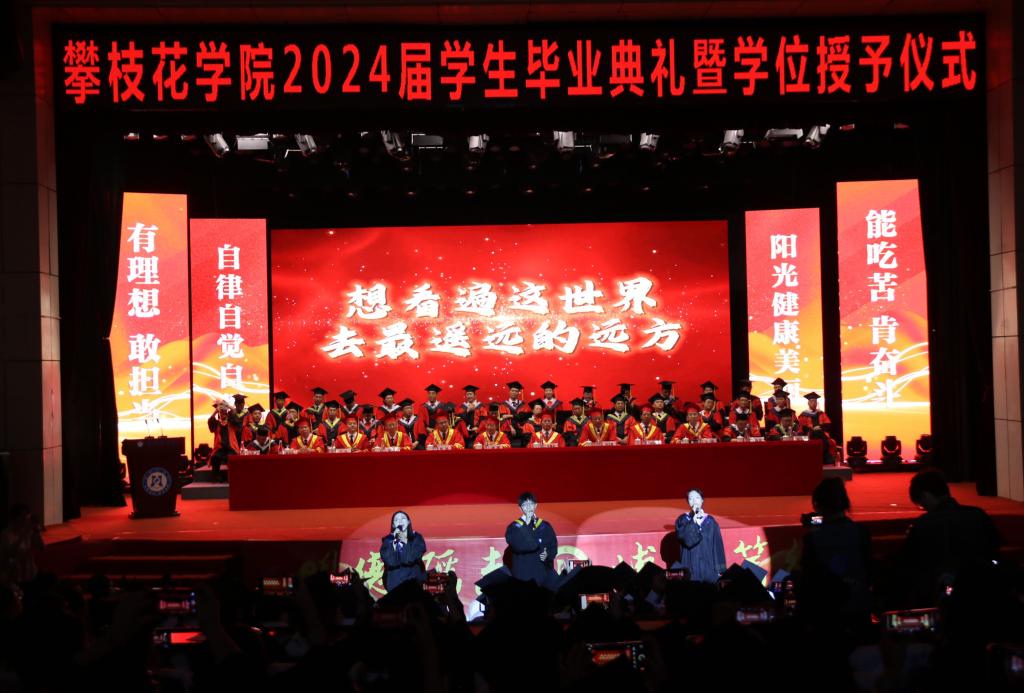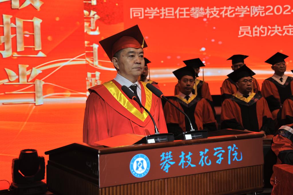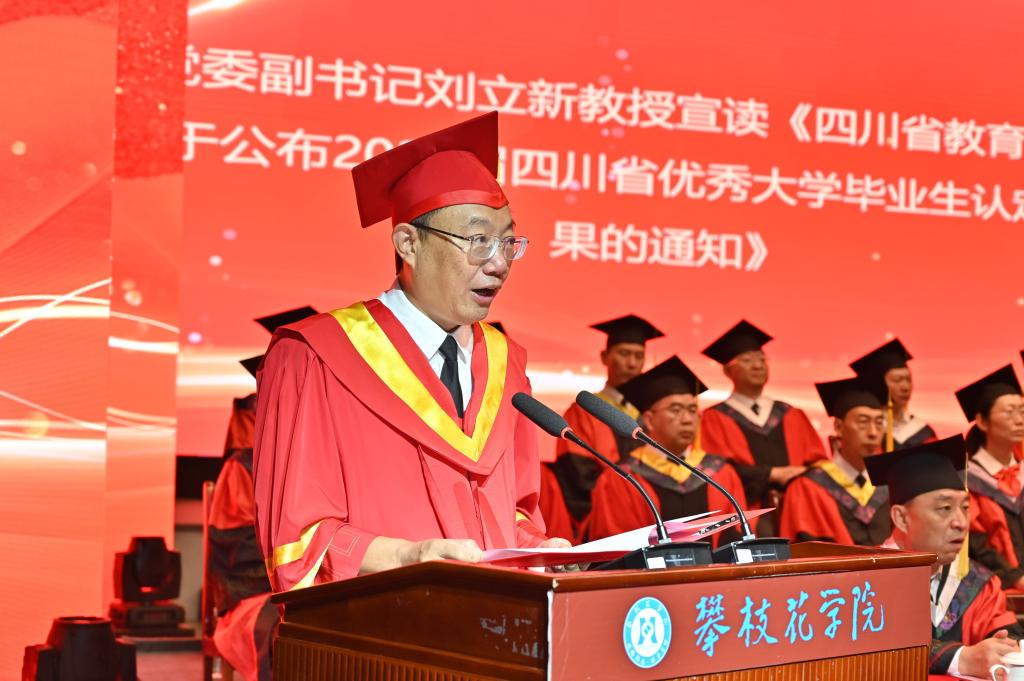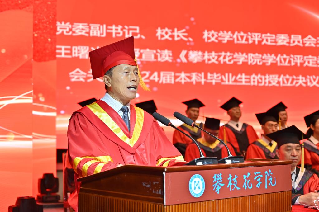 典礼上,党委副书记、校长王曙光宣读《攀枝花学院学位评定委员会关于2024届本科毕业生的授位决议》,党委副书记刘立新宣读《四川省教育厅关于公布2024届四川省优秀大学毕业生认定结果的通知》,副校长王兵宣读《关于聘任龚鳗等116名同学担任攀枝花学院2024届毕业生校友联络员的决定》。