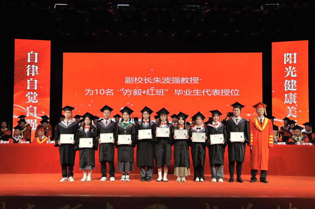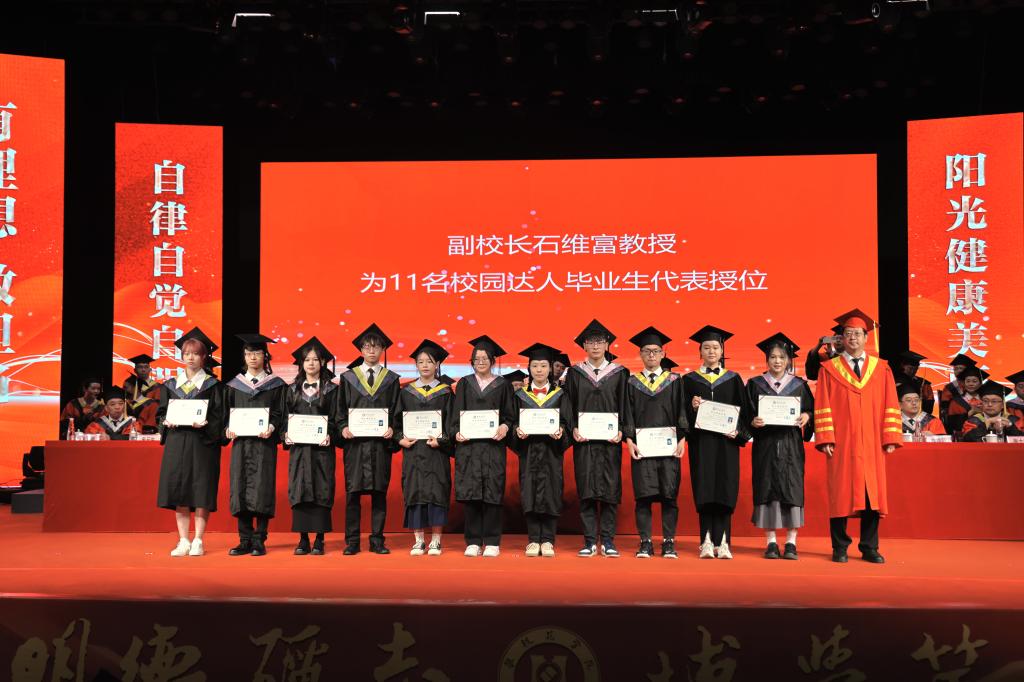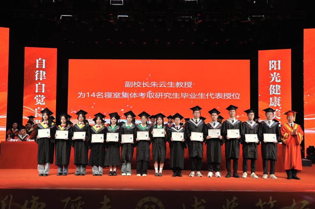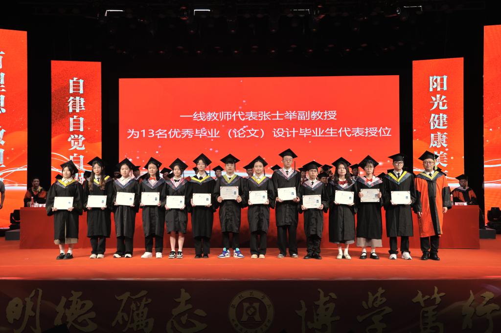 在毕业生授位环节,胥刚为四川省优秀大学毕业生代表13人授位,王曙光为学习标兵代表13人授位,彭徐为扎根攀枝花地区就业毕业生代表10人授位,刘立新、朱波强、石维富、王兵、朱云生分别为“青马班”毕业生代表、方毅•红班毕业生代表、校园达人毕业生代表、校友联络员代表、寝室集体考取研究生毕业生代表授位,附属医院党委书记田巨龙、中心医院党委书记徐文豪为毕业的巴基斯坦留学生18人授位。一线教师代表张士举为13名优秀毕业(论文)设计毕业生代表授位。授位导师依次为参加现场授位的毕业生授位。