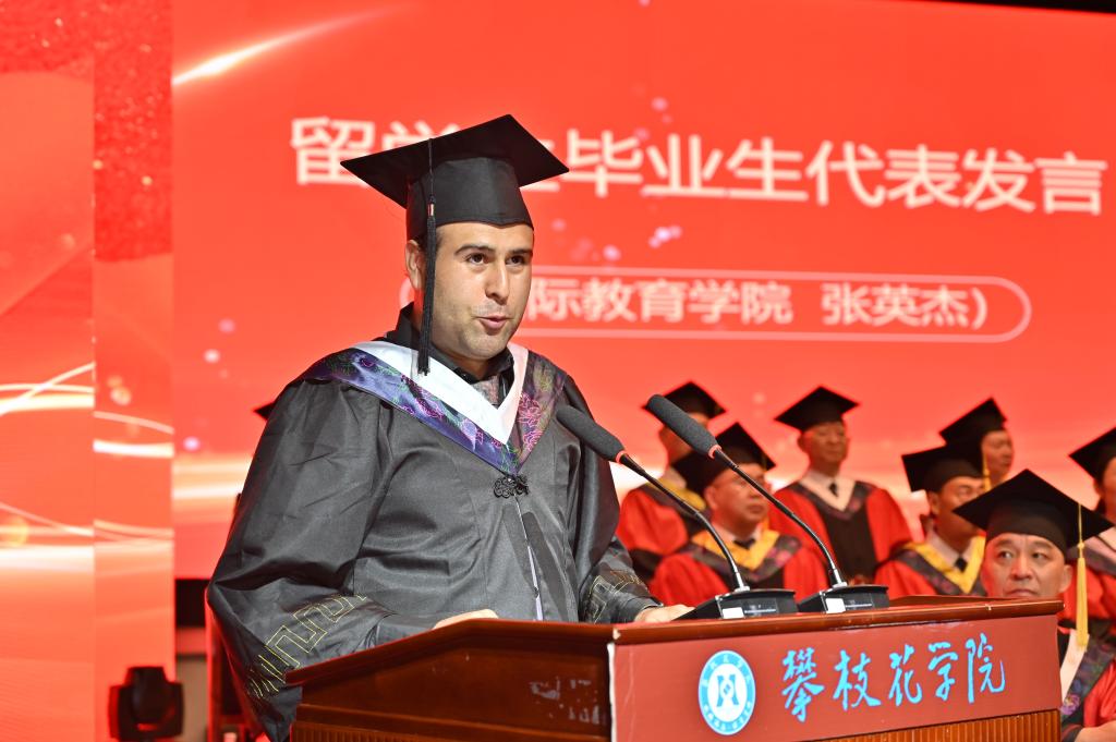 国际教育学院留学生代表张英杰在发言中表达了对母校和老师的感激之情,他表示会将在攀大六年的留学时光铭记于心,将所学倾心奉献家乡的医疗卫生事业,同时做中华优秀传统文化的学习者、传递者、交流者,推进中巴友谊。