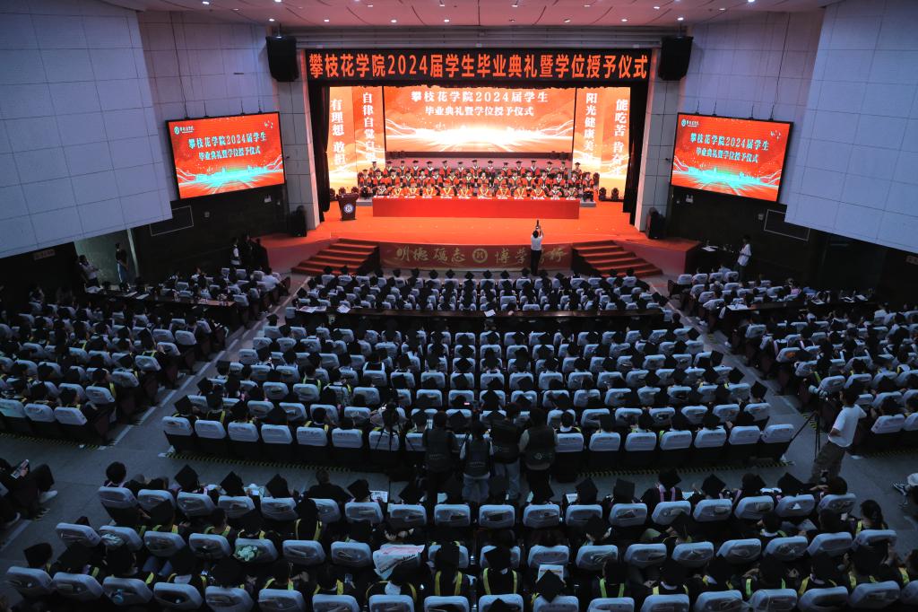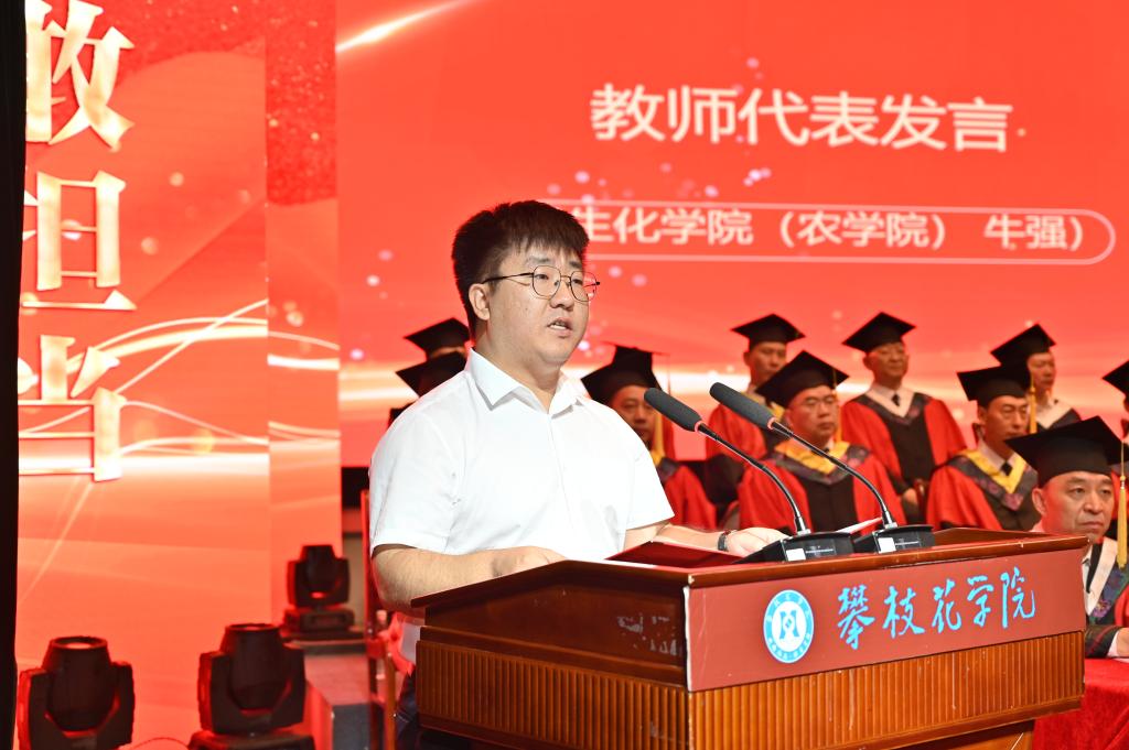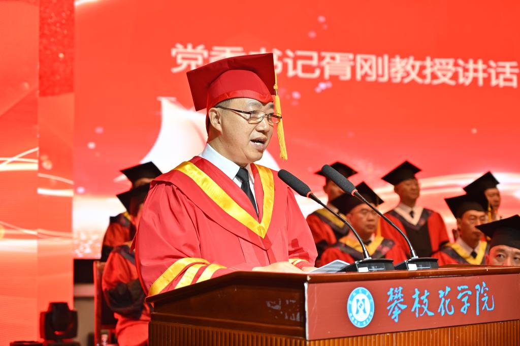 典礼上,党委书记胥刚作题为《阳光照亮前程,美丽相伴人生》毕业致辞。他对顺利完成学业、继续读研深造、在创新创业大赛中取得优异成绩、校园之星和校园达人、方毅·红班、服务西部、扎根基层、扎根攀枝花的同学们和18名巴基斯坦留学生表示热烈祝贺。感谢广大学子把阳光健康美丽注入攀大,把人生最美好的青春留在攀大,希望留学生们将所学所得奉献家乡,推进文化交流、共缔中巴友谊。
