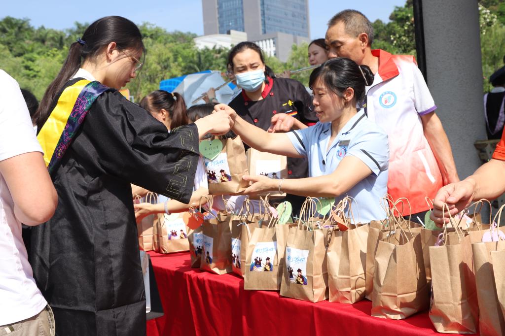 典礼结束后,学校后管处在静明湖畔为毕业生们准备了3500余份由学校六个食堂赞助的“专属芒果毕业礼”,祝愿毕业生们在未来的人生道路上光“芒”万丈,在今后的职业生涯中结下累累硕“果”。