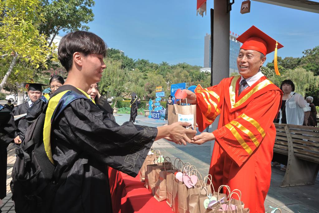 620日上午,静明湖畔热闹非凡,由后勤管理处主办学校六个食堂赞助的3500余份“专属芒果毕业礼”在此发放。为了确保活动顺利开展,后管处积极联系当地果农,产地选果采果,发动后勤战线的一线人员、食堂工作人员以及学弟学妹精心填写祝福卡片,只为让毕业学子们带着“花城的阳光”启程。校党委书记胥刚、党委副书记、校长王曙光、党委副书记刘立新、党委常委、副校长朱波强、朱云生等校领导亲临现场亲切的为毕业生及家长代表发放毕业礼,送上美好真挚的祝福,希望学子们带着母校的味道一路光“芒”万丈、硕“果”累累!
