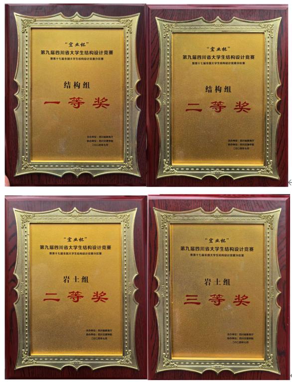 我校四支参赛队伍由史新君老师领队,在郭剑、张凯、刘瑞峰、余为维四位教师的指导下,与来自四川大学、西南交大等23所高校的45支结构组代表队、34支岩土组代表队进行了激烈角逐,最终斩获一等奖1项、二等奖2项、三等奖1项,并荣获本届竞赛“优秀组织奖”。