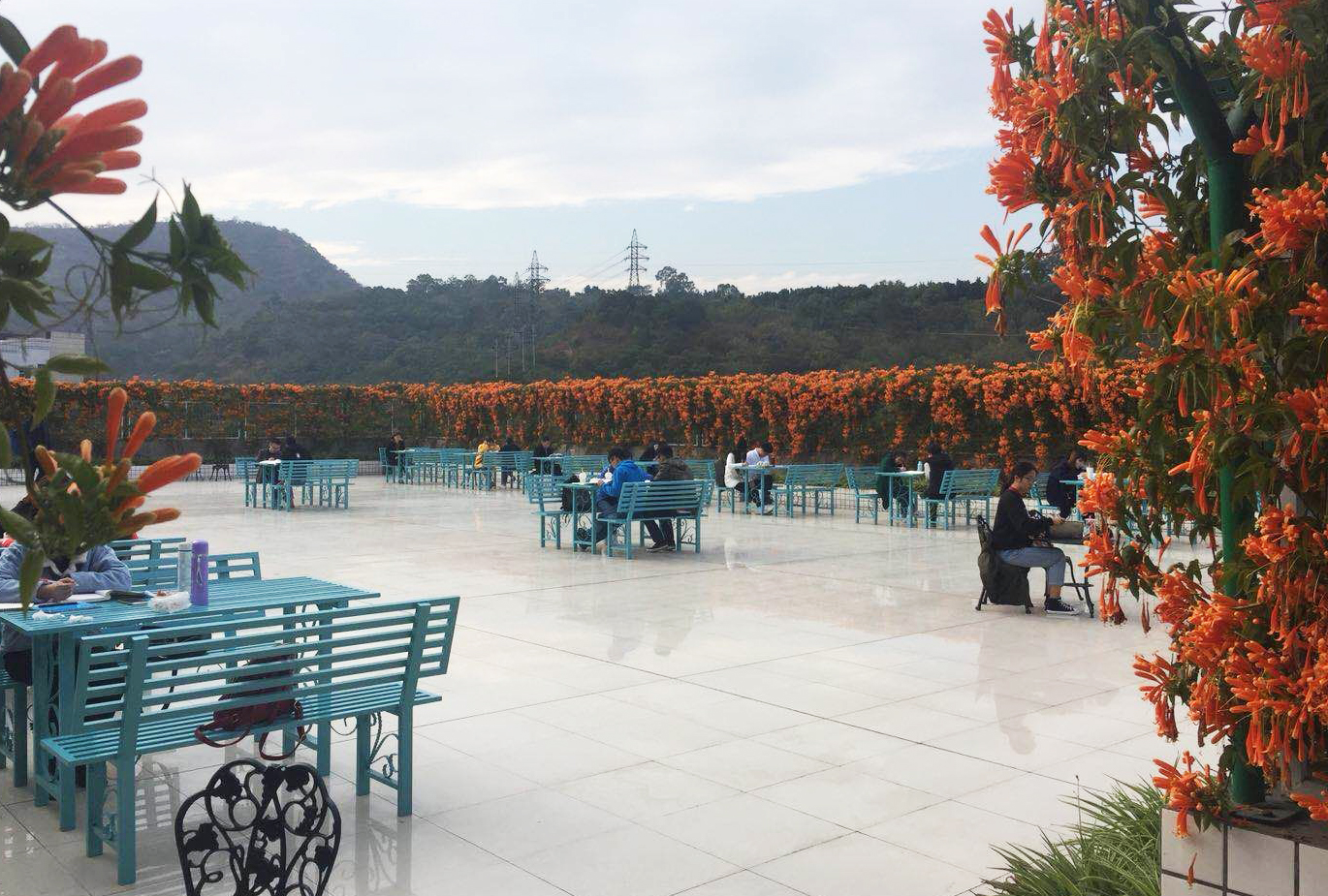 在后勤专人常年精心养护下,阳光室外阅读区藤蔓萦绕、鲜花灿烂、空气清新、视野开阔,阳光下一片一片娇艳盛开的鲜花、一墙一墙绿意盎然的藤蔓,与馆舍周围人工湖、草坪、植物、亭台以及馆舍中庭花木、室内罐装小植物等相得益彰,共同构建花园图书馆的自然之美和生态之美,尽显人与自然和谐共融的无限美好,使读者放松心情,缓解压力,安心、静心、舒心、养心。在这室外学习的理想之地,学生可以尽享阅读的美好,感受学习的魅力。