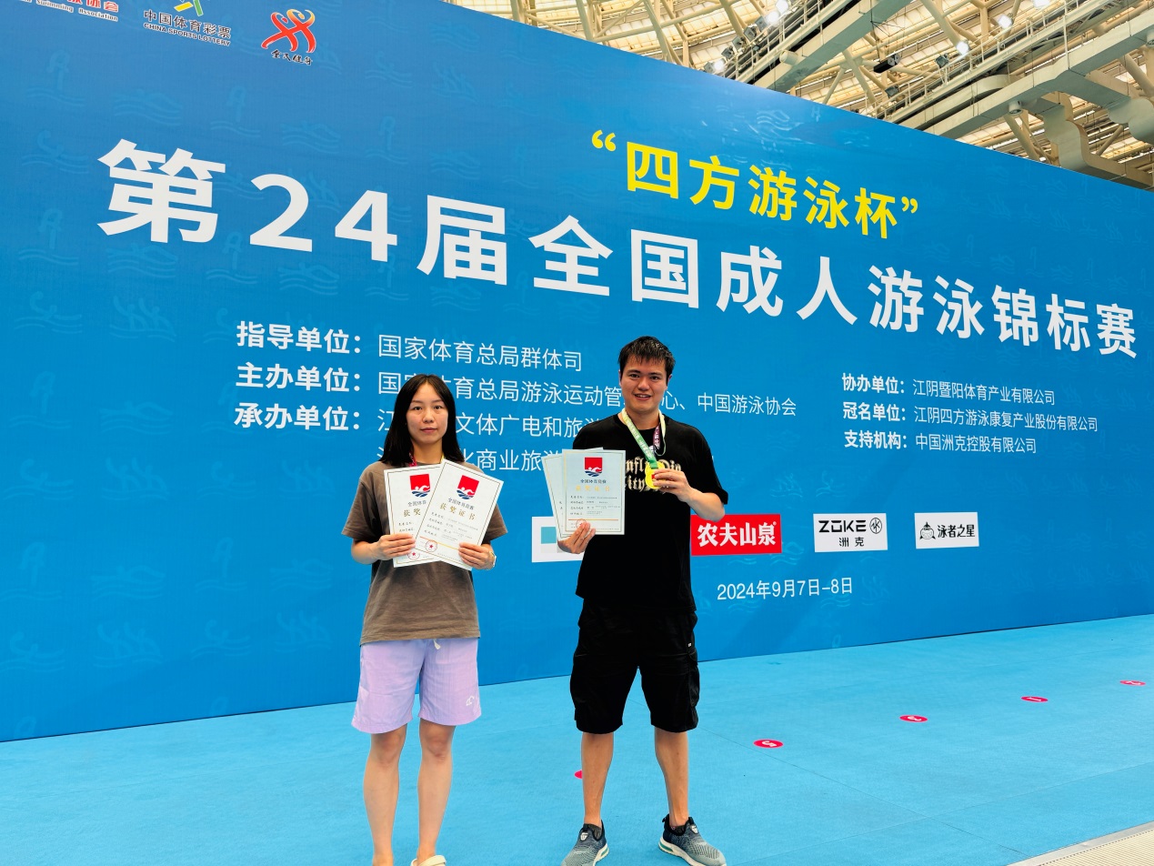 9月7日,由国家体育总局游泳运动管理中心 、中国游泳协会主办的第24届全国成人游泳锦标赛在江苏省江阴市体育中心游泳馆开赛。来自全国各地42个代表队,共计800余名运动员参赛。经过2天角逐,我校教师程浩然获得30-34岁组100米仰泳第一名,30-34岁组200米混合泳第一名;李子钰获得25-29岁组50米蛙泳第二名,25-29岁组50米自由泳第五名的优异成绩。