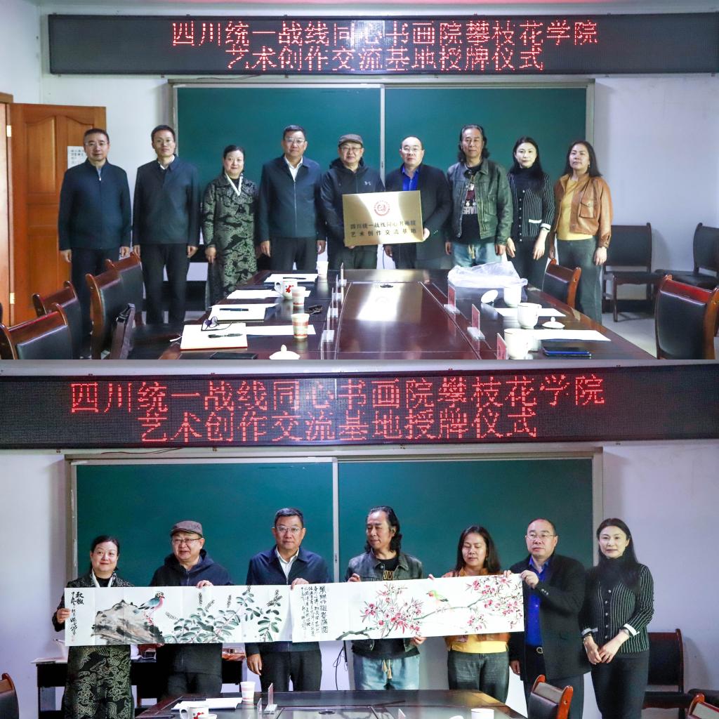 会上,孙成代表四川统一战线同心书画院,向攀枝花学院艺术学院授予了四川统一战线同心书画院攀枝花学院艺术创作交流基地的牌匾,学校艺术学院相关负责人代表学院接牌。此外,来自四川统一战线同心书画院的多位书画家,向攀枝花学院赠送他们的书画作品。