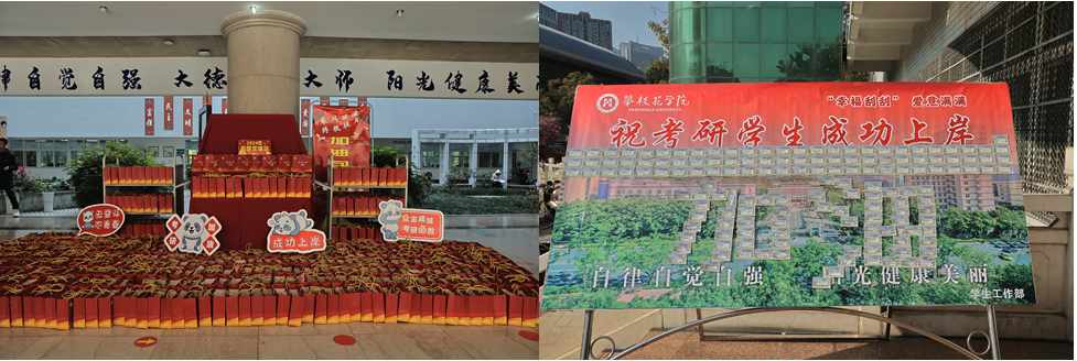 期间,学校在图书馆一楼大厅布置了一个“考研加油站”,并为考研学子送上800份爱心大礼包;同时还在图书馆门口和柱桂社区布置了 “幸福刮刮”展板,展板上张贴了来自各单位、部门师生祝福语共计1000张,考研学子刮出温暖人心、提振士气的祝福语,深刻感受到来自全校师生满满的爱意和全力的支持。13个二级学院也根据实际情况,自行安排考研慰问,为学子考研路上“最后一公里”保驾护航。