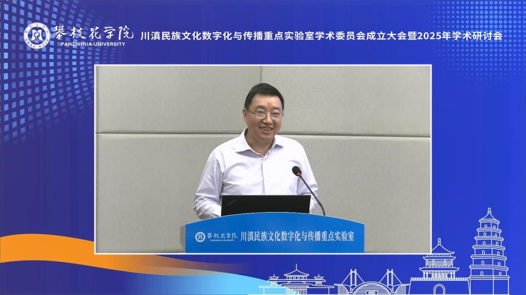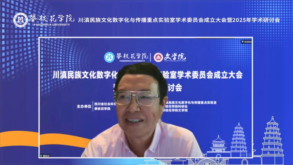 6月17日上午,川滇民族文化数字化与传播重点实验室学术委员会成立大会暨2025年学术研讨会在攀枝花学院清风厅隆重举行。会议线上线下同步进行。欧洲科学与艺术院院士、教育部“长江学者奖励计划”特聘教授、四川大学杰出教授曹顺庆,中央民族大学荣誉资深教授戴庆厦中国社科院聂鸿音西南民族大学原校长赵心愚、曾明教授,以及来自四川大学、云南师范大学、大理大学、成都大学等11所高校和科研院所的19位专家学者线上参会。实验室主任、攀枝花学院党委书记胥刚,攀枝花学院党委副书记、校长李兴贵出席会议。攀枝花学院副校长王兵主持会议,学校师生代表90余人参会。