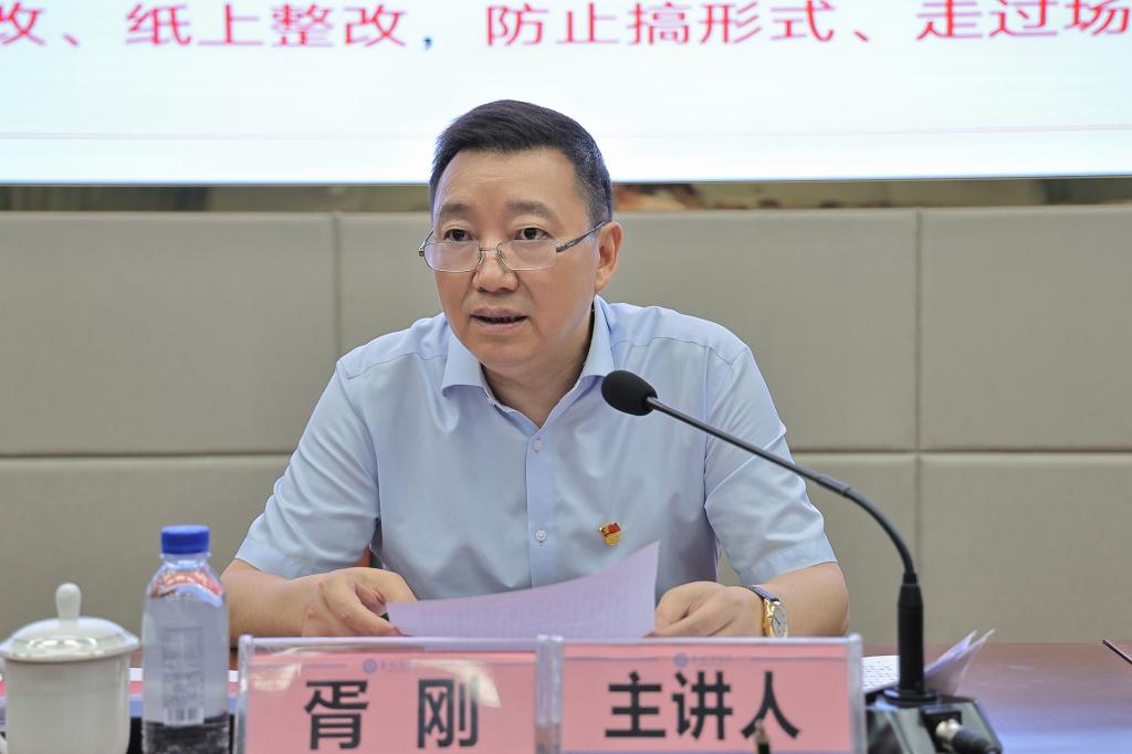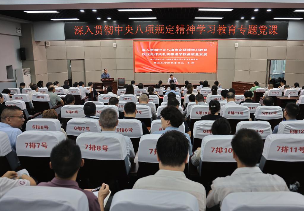 625日下午,党委书记胥刚以《深入贯彻中央八项规定精神学习教育  以优良作风扎实推进学校高质量发展》为题讲授专题党课。全校中层干部、各基层党支部书记,马克思主义学院、文学院、附属医院教师党员代表参加党课学习。