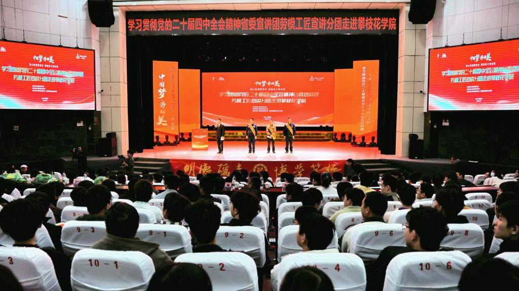 1120上午,学习贯彻党的二十届四中全会精神省委宣讲团劳模工匠宣讲分团首场主题宣讲活动在我校圆满举行,攀枝花市总工会党组成员、副主席周健,校党委副书记刘立新出席活动,校工会、马克思主义学院、学工部相关负责人参加活动。活动将党的二十届四中全会精神与劳模工匠的奋斗故事深度融合,三位来自一线的劳模工匠以奋斗故事为载体,将全会精神融入生动宣讲,为近千名师生送上了一堂别开生面的“成长思政课”。