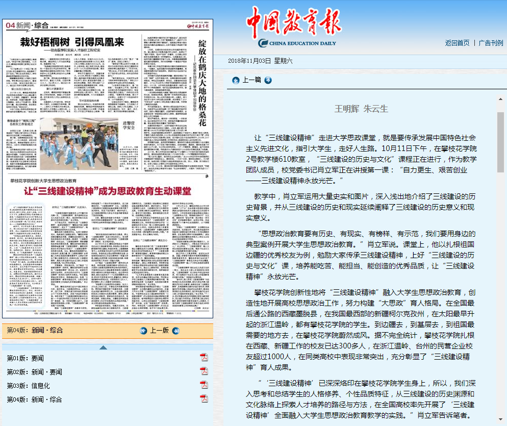 113日,《中国教育报》以《让三线建设精神成为思政教育生动课堂》,专题报道我校大学生思想政治教育工作创新做法。