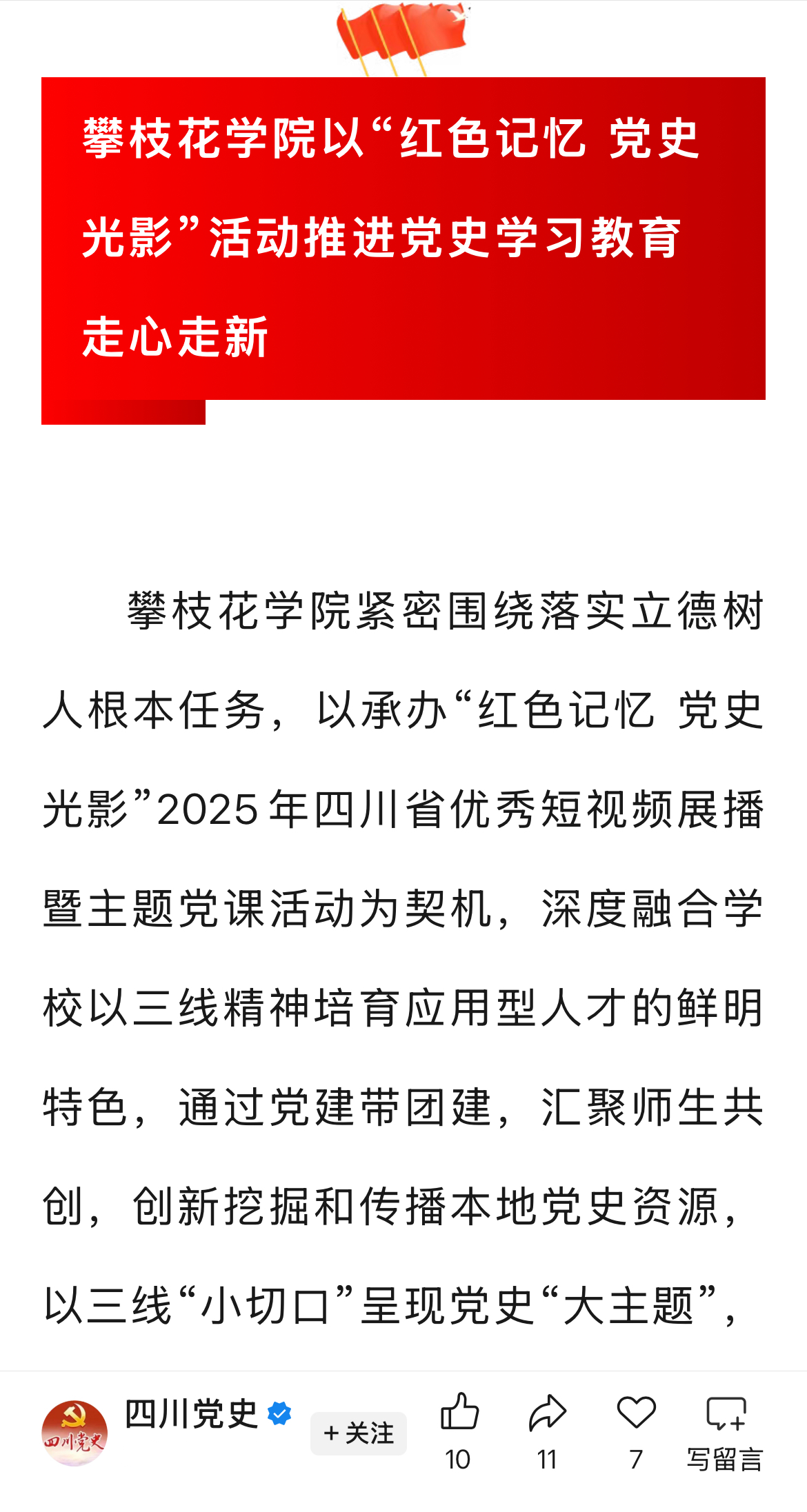 近日,四川党史文献网及四川党史微信公众号以《攀枝花学院以“红色记忆党史光影”活动推进党史学习教育走心走新》为题报道我校以承办“红色记忆 党史光影”2025年四川省优秀短视频展播暨主题党课活动为契机,深度融合学校以三线精神培育应用型人才的鲜明特色,通过党建带团建,汇聚师生共创,创新挖掘和传播本地党史资源,以三线“小切口”呈现党史“大主题”,让党史教育走进课堂、融进专业、落到师生,推进党史学习教育走心走新。