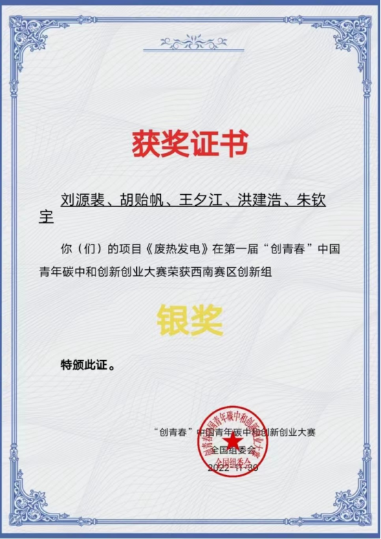 第一届“创青春”中国青年碳中和创新创业大赛于12月初评审结束,我院新能源科学与工程、冶金工程专业的刘源裴、梁俊杰、许平、赵兴宇、曾欣等学生在指导教师张士举、徐众、侯静和钟璨宇的带领下,斩获西南赛区创新组银奖1项、铜奖3项、优胜奖1项。