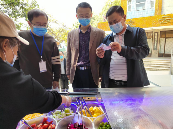 朱波强一行来到学校食堂,重点对大宗物资采购进货、三防设施配备及使用情况、食堂主要信息公示以及台账记录情况等方面进行了检查指导,并对存在的问题提出了整改措施,随后与后管处饮食服务中心全体员工召开了调研会。会上,朱波强强调,食品安全只有起点没有终点,食品安全管理工作一定要落实、落细、落小,从源头上防控,在过程中管控,提升管理人员安全意识,守住师生舌尖上的安全。