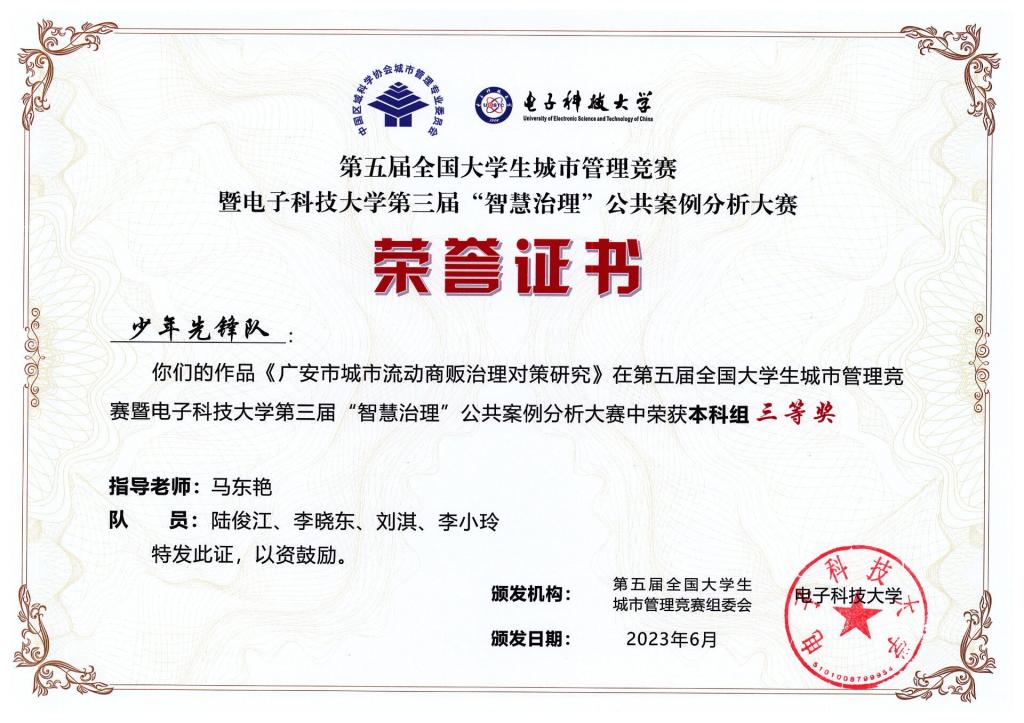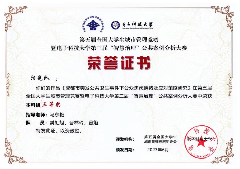 近日,由教育部全国城市管理专业教学指导委员、中国区域科学协会城市管理专业委员会主办,电子科技大学承办的第五届全国大学生城市管理竞赛暨电子科技大学第三届“智慧治理”公共案例分析大赛评审结束。我校法学院马东艳老师带领行政管理专业队伍参加比赛,并荣获本科组三等奖3项。