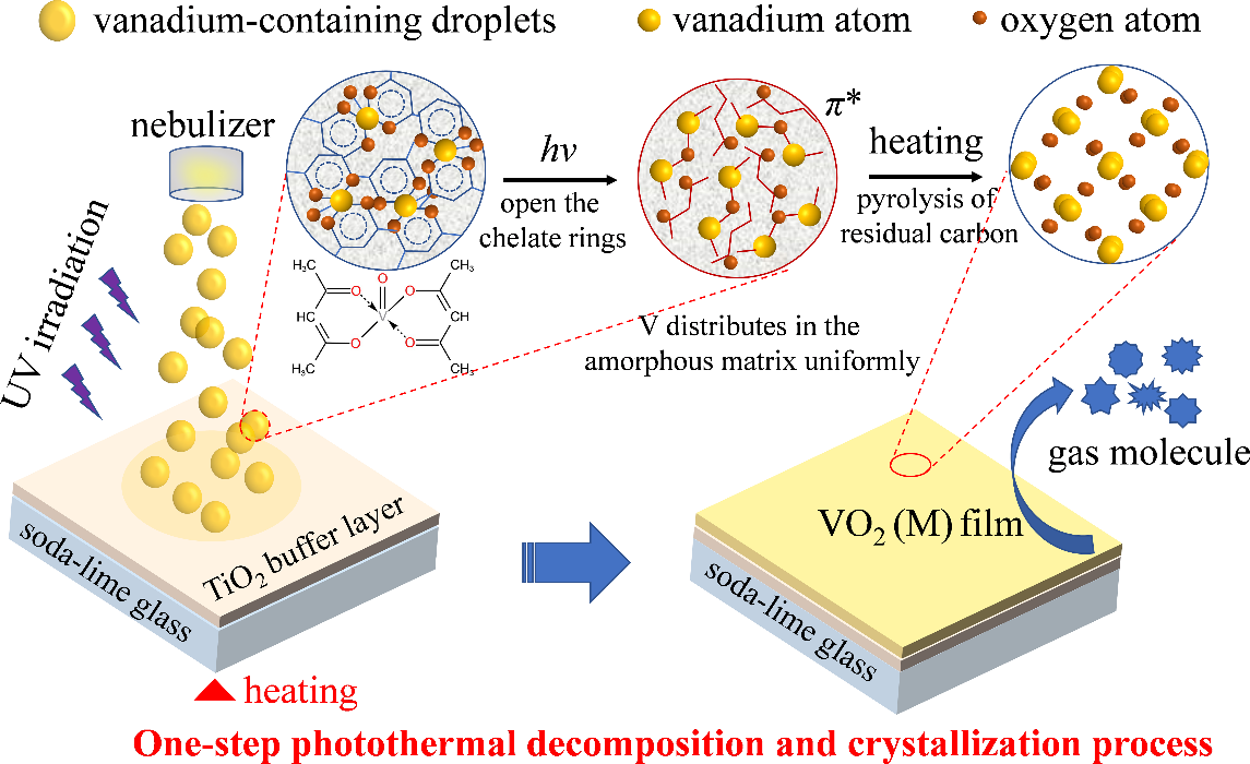 该成果聚焦二氧化钒智能窗应用,首次提出光辅助喷雾热解制备路线,可实现在二氧化钛缓冲层的普通玻璃表面快速制备二氧化钒薄膜。与传统喷雾热解工艺相比,经光辅助热解后得到的二氧化钒薄膜,由于M相二氧化钒生长得到促进,使其可视透过率提升了17%,太阳光调解率提升了40%。该研究成果为低成本、大面积、高效制备二氧化钒智能窗提供了新思路。