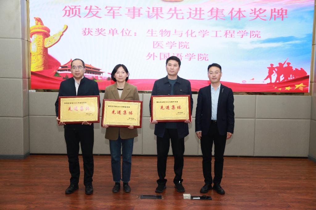 校武装部为生物与化学工程学院、医学院、外国语学院颁发2023年军事课先进集体奖牌。