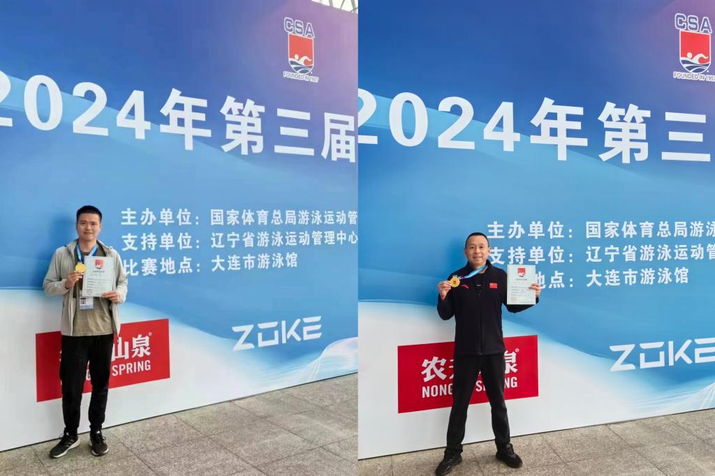 我校体育部教师胡泯、程浩然不畏酷暑,刻苦训练,积极备战,最终,胡泯获得男子200米自由泳(M组)第一名,男子100米自由泳(M)组第二名。程浩然获得男子200米个人混合泳(H组)第一名,男子100米蝶泳(H组)第二名。