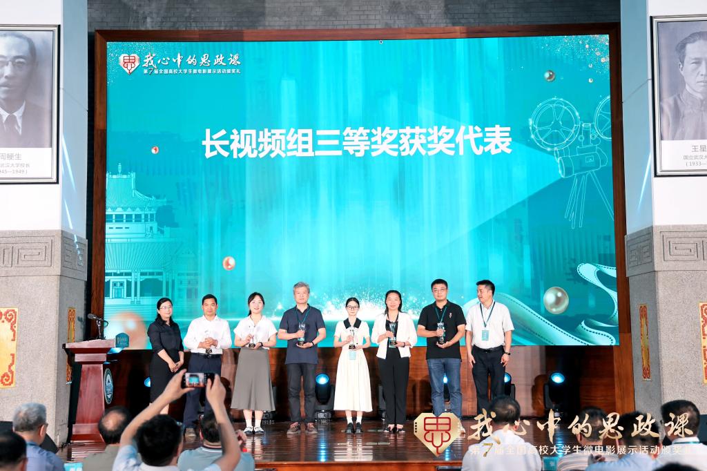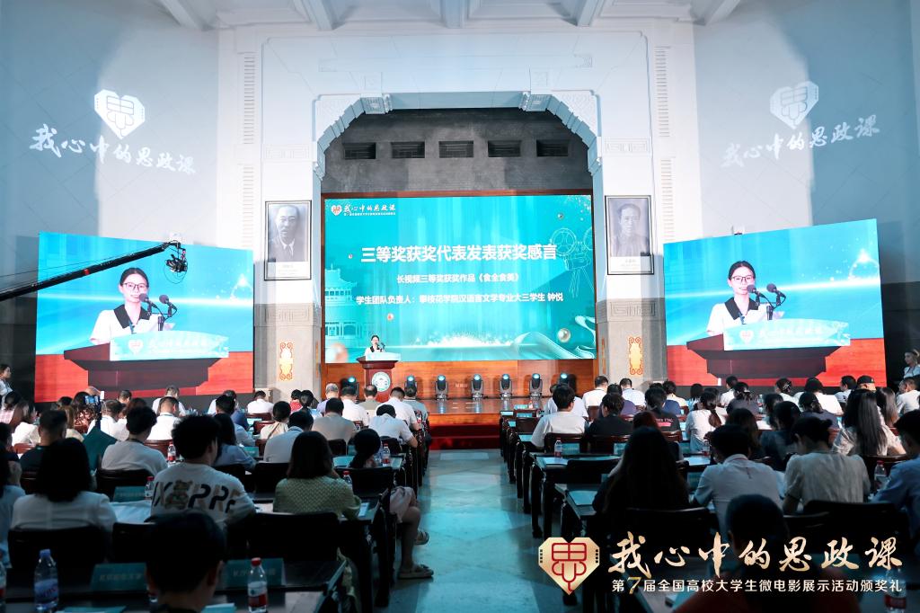2024614日晚,由教育部社会科学司指导、教育部高校思想政治理论课教学指导委员会主办、武汉大学马克思主义学院承办的第七届“我心中的思政课”全国高校大学生微电影展示活动颁奖典礼在武汉大学樱顶老图书馆隆重举行。马克思主义学院《食全食美》学生创作团队负责人、文学院钟悦受邀参与此次颁奖典礼并代表三等奖获奖团队发表感言。