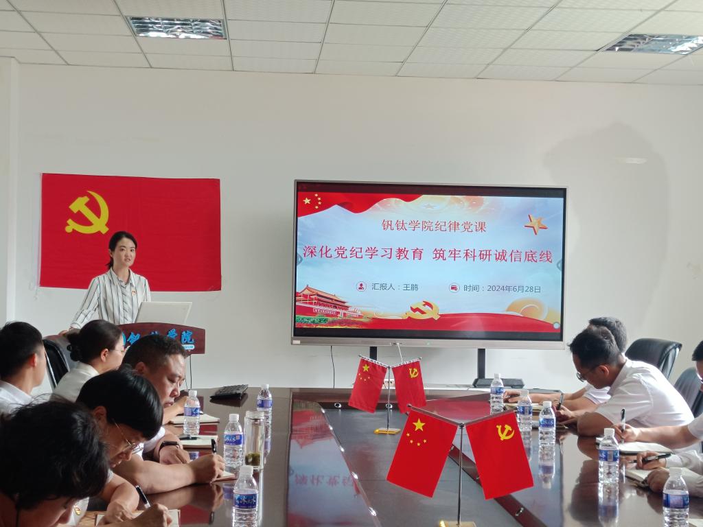 王鹃作题为“深化党纪学习教育  筑牢科研诚信底线”的党纪学习教育专题党课。党课从党纪教育的历史脉络回顾;以案说纪—解读《中国共产党纪律处分条例》“六大纪律”;立足实际,学习党纪,筑牢科研诚信底线三个方面开展学习。党课采用以案说纪的方式,重点讲解了“六大纪律”中高校教师违反相关纪律的典型案例,并结合钒钛学院党员教师的实际探讨了如何树牢党纪党规的底线意识。同时,立足实际,结合学院科研诚信与师德师风建设,强调科研诚信的重要性及学术不端等违纪违法行为的严重后果,要求全体党员加强党性修养,提高纪律意识,加强学术自律;最后呼吁广大教师在科研工作中践行科研诚信,做到遵守道德规范、克服浮躁虚荣,铭记科研诚信的重要性,深化党纪学习教育,潜心科学研究。
