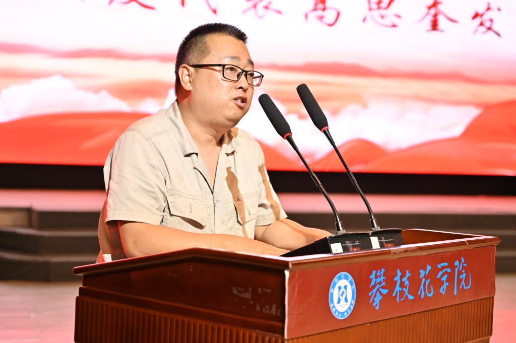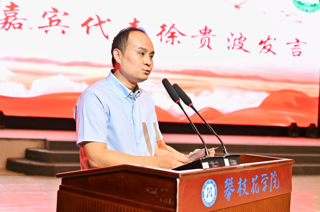 学院校企合作企业——四川东立科技股份有限公司综合管理部副经理徐贵波发言。他以实习为基础,告诫新同学如何珍惜大学时间和资源,鼓励大胆尝试,不要害怕失败,以“修学储能,经世致用”与新生共勉。