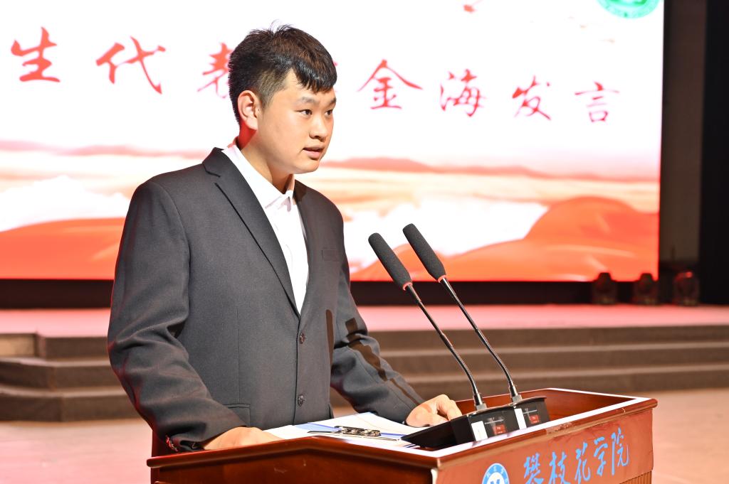 老生代表谭金海,从学长的角度谈到了对大学学习生活的体会。他说,在大学只有明确自己的目标,保持学习的热情,培养自我综合能力,才能在大学生活中绽放光彩。