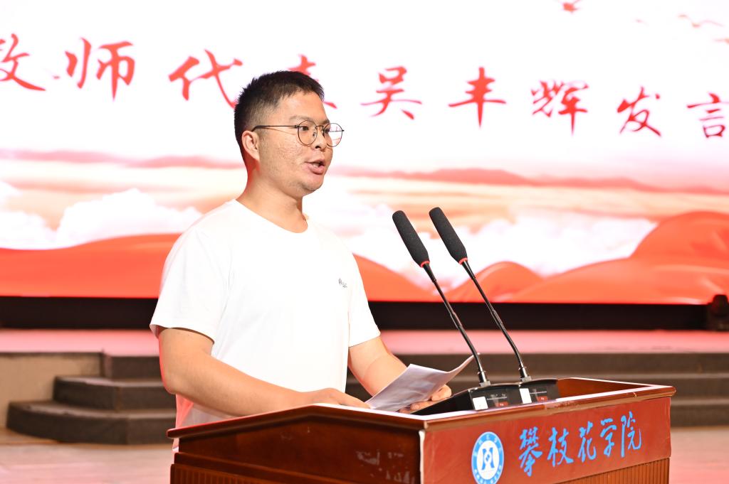 教师代表吴丰辉通过自己的学习经验寄语新生:在大学校园里,要明确学习目标和职业规划,培养良好的学习习惯,积极参加社会实践,保持积极乐观的心态。