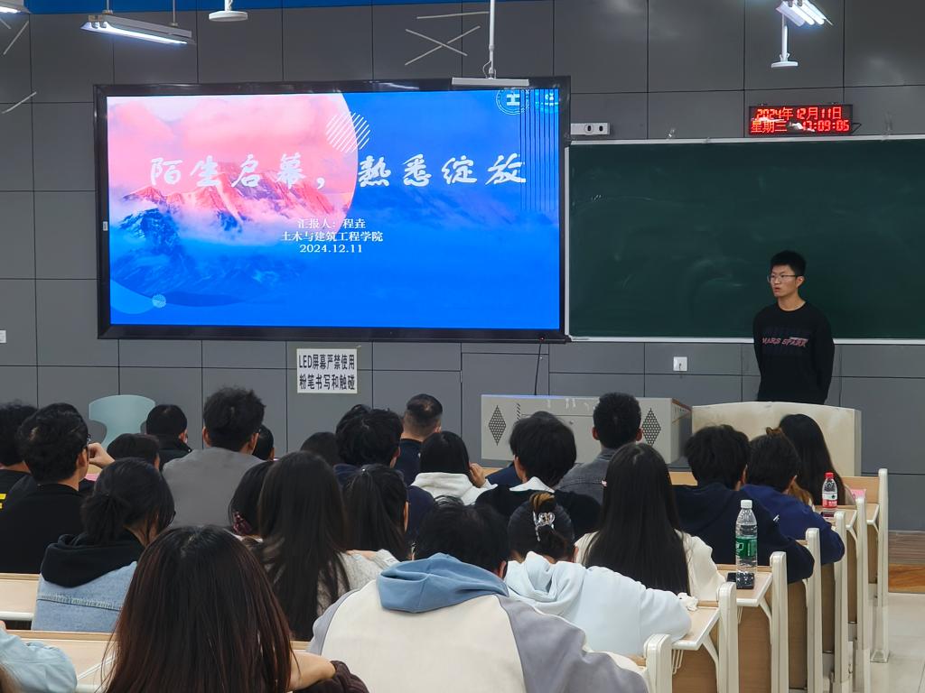 方毅·钛班优秀学员程垚,以“陌生启幕,熟悉绽放”为题向同学们分享了由初入大学的迷茫到加入钛班锻炼的成长路径。他在“明德砺志,博学笃行”的校训感召下,逐渐认识到大学生的责任,树立明确的学习和个人成长目标,期间参与导师的课题,撰写并发表论文。他号召同学们要志存高远,心怀感恩,脚踏实地、笃行不怠,在学习与实践中不断精进自我,始终保持对知识的渴望和对学术的追求。
