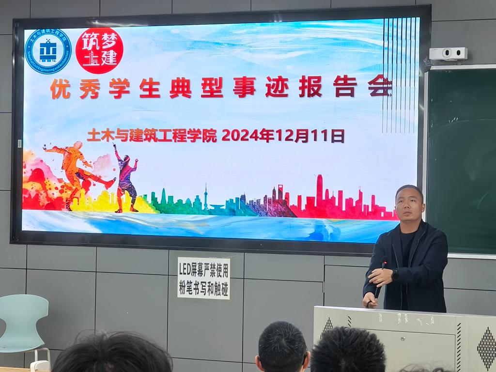 为推进育人工作大抓落实,充分发挥先进典型示范引领作用,激励广大青年学生树立坚定理想,勇于挺膺担当,践行“请党放心、强国有我”的青春誓言,土建学院于1211日在2-114教室举办以“凝聚青春力量,树立榜样引领”为主题的优秀学生典型事迹报告会,学院遴选四名优秀学生代表做报告分享。学院党委书记张敬东,党委副书记、纪委书记付建出席会议,学生科科长王宁军、全体辅导员、团学干部、学生代表共计200余人参加报告会,会议由学院团委书记杜郁美主持。