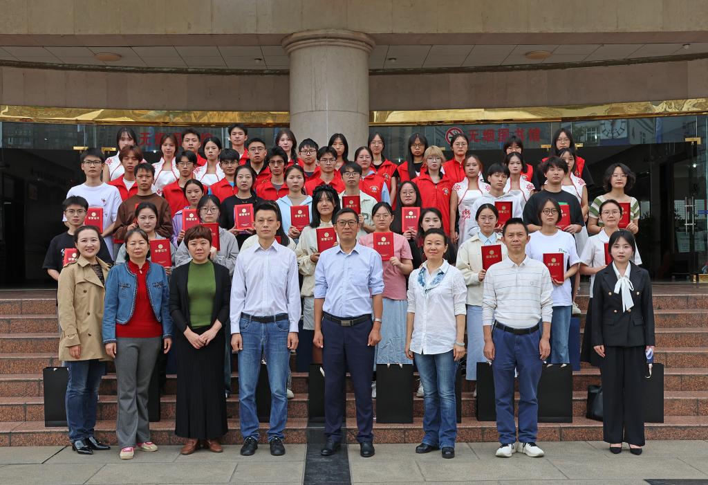 6月4日下午,我校2025届毕业生“阅读之星”和“进馆达人”表彰颁奖仪式在图书馆一楼大厅举行。图书馆馆长王欢、副馆长何中勇以及图书馆相关老师和获奖学生参加。活动现场老师为获奖同学颁发了荣誉证书并赠送文具纪念品。