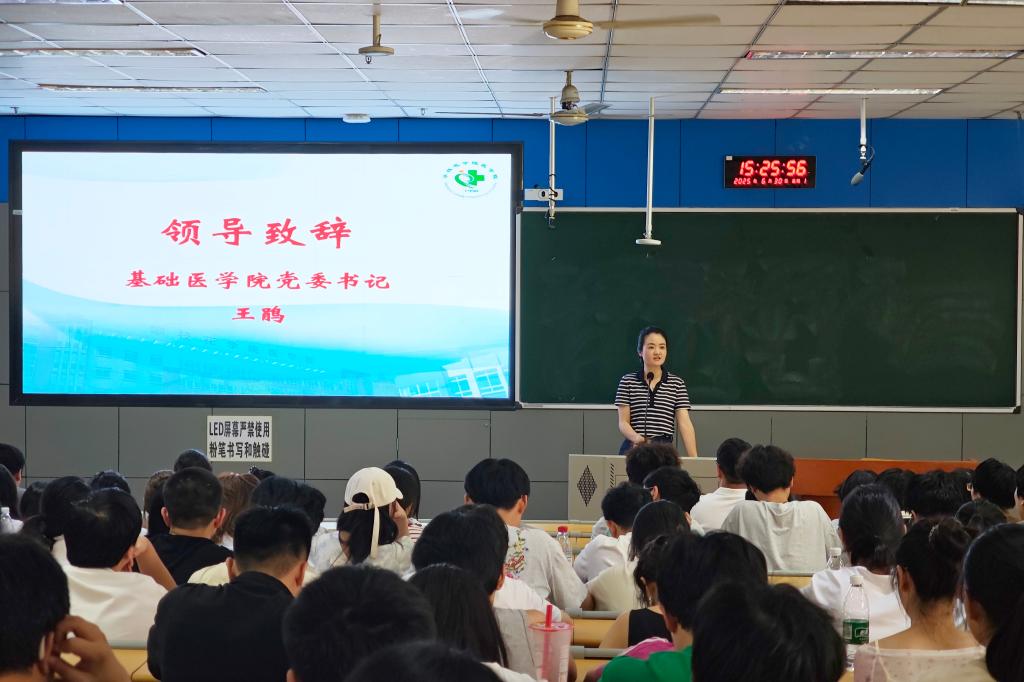 最后,基础医学院党委书记王鹃以“收获知识、提升技能、锤炼品格,以实际行动践行医学使命”为题作动员讲话。她从医学教育的专业角度深入阐释了临床见习的重要意义,明确了见习期间的具体要求,并代表学院向同学们提出了殷切期望。她强调,临床见习是医学生培养过程中的关键环节,希望同学们以饱满的热情投入实践学习,在临床一线锤炼专业技能,培养医者仁心。