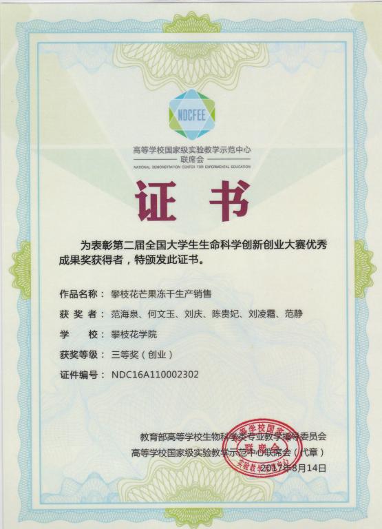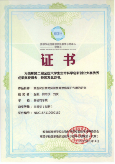 近日,由教育部高等学校生物科学类专业教学指导委员会、国家级实验教学示范中心联席会联合主办的第二届全国大学生生命科学创新创业大赛在兰州大学圆满落幕。我校学子参赛作品“黄连化合物对实验性胃溃疡保护作用的研究”和“攀枝花芒果冻干生产销售” 喜获三等奖。