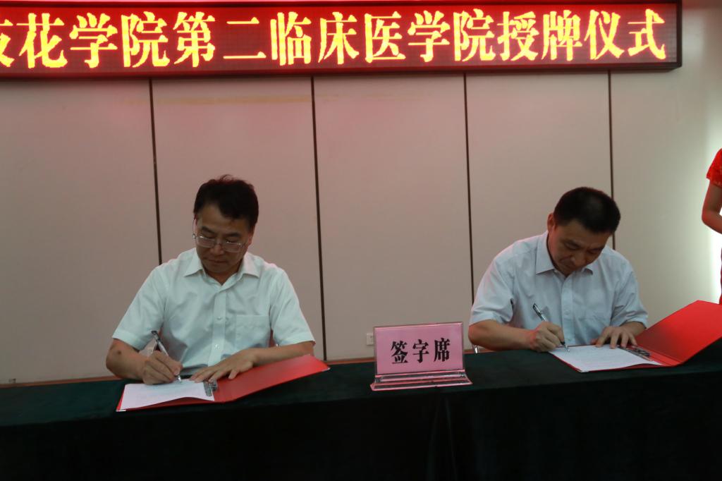仪式上,徐翠宣读了《攀枝花市卫生和计划生育委员会关于同意市中心医院成为攀枝花学院第二临床医学院的批复》,刘立新宣读了《攀枝花学院关于同意攀枝花市中心医院为第二临床医学院的通知》。黄双华和徐文豪分别代表我校和中心医院签署中心医院成为学校第二临床医学院的协议。马晓凤、肖立军、徐翠、徐文豪共同为我校第二临床医学院揭牌。