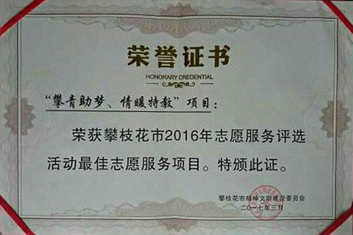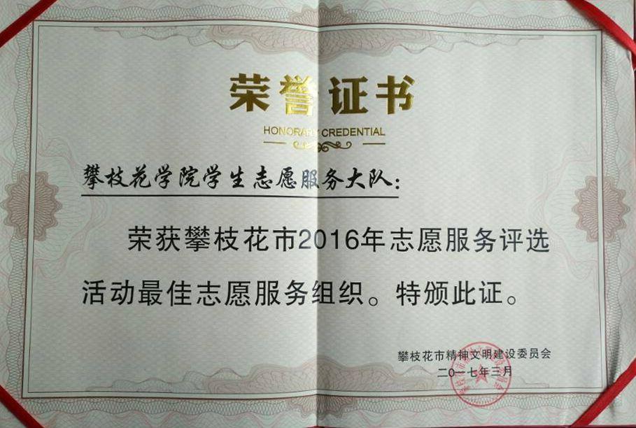 近日,攀枝花市精神文明建设委员会开展了攀枝花市2016年志愿服务评选活动,并于3月3日在中心广场举办了颁奖仪式,攀枝花市委宣传部等15个市级志愿服务支队共500名志愿者代表参加本次活动。我校学生志愿服务大队荣获 “最佳志愿服务组织”,“攀青助梦,情暖特教”西区特教志愿服务项目荣获 “最佳志愿服务项目”,志愿者朱涛荣获“优秀志愿者”。
